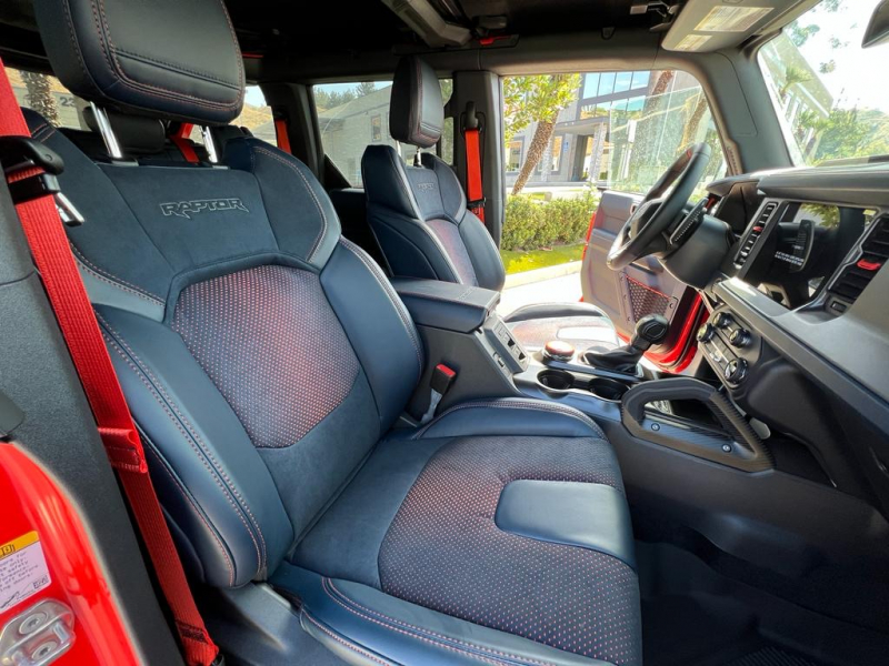 デザインでは、G.O.A.T.モードのロータリーダイヤル、ダッシュベント、ドアネット、ステアリングホイールのステッチ、インパネのブロンコロゴにフォードパフォーマンスコードオレンジがアクセントに。また、プッシュボタンイグニッションもコードオレンジでライトアップされる。グラブハンドル、ステアリングホイールベゼル、ギアシフターなどのタッチポイントには、光沢を抑えたカーボンファイバーのアクセントをあしらった。さらに専用仕様として、マグネシウム製パドルシフトと、グロスブラックのラプターロゴを中央に配した、厚みのあるスポーツタイプのステアリングホイールも用意される。