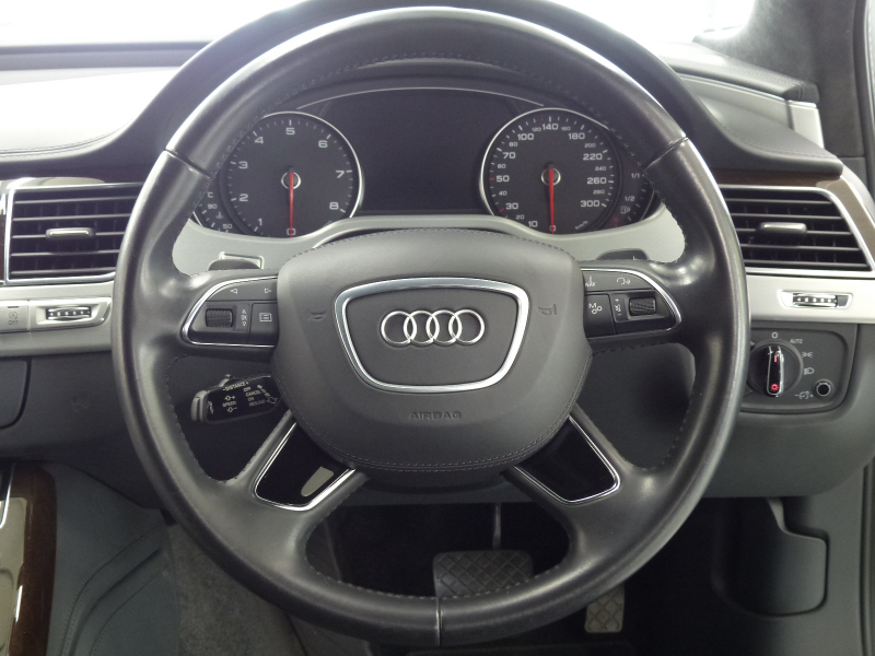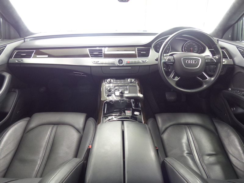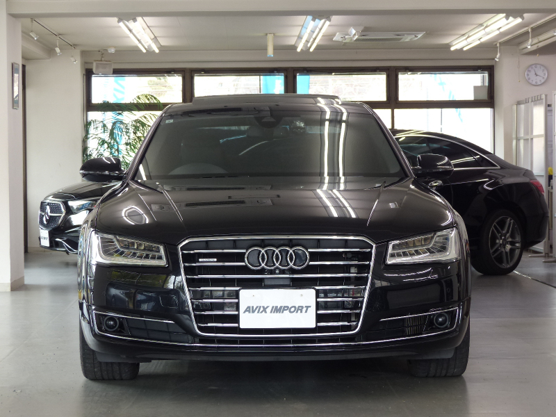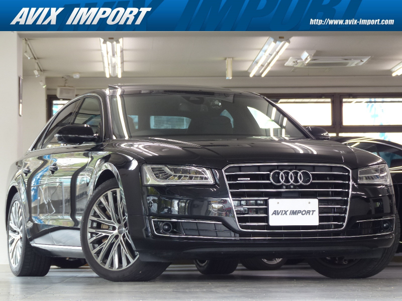Audiのトッププレミアムセグメントに位置するA8!! 禁煙車 取説・記録簿付き もちろん修復歴御座いません!! 最高出力435PS(カタログ値)という圧倒的なパワーを発揮する4.0L V型8気筒DOHCインタークーラー付ターボチャージャーを搭載し、電子制御ティプトロニック機構付き8速AT&エネルギーリカバリーシステム&スタートストップシステム&シリンダーオンデマンドシステム(気筒休止システム)などによりエンジン効率を高めて燃費向上を実現!! Audiならではのドライブセレクトとアダプティブエアサスペンションが標準装備され、様々な運転シーンごとに、意のままに走りを選び楽しむことが出来ます!! 後期型よりシングルフレームグリルデザインやバンパー&ボンネット形状を刷新し、革新的なマトリクスLED技術を使用したヘッドライトを採用!! 外装色は人気のファントムブラックパールエフェクト!! 足回りにはF8型オプションの20スポークデザインコントラストグレーパートリーポリッシュト20インチアルミホイールを装備!! 内装は贅沢なヌメ革を使用したバルコナブラックレザー&ウッドパネルの組み合わせ!! タッチパッドと電動格納式大型モニターを備える最新世代のMMIにより直感的な操作を可能とし、ストレスの無いドライビングをご堪能頂けます!! シートポジションを細部まで設定できるコンフォート機能やシートから冷風が出るベンチレーションシート付のコンフォートシートが標準装備!! さらには上級グレードならではの安全装備プレセンスパッケージ&サラウンドビューカメラ&パークアシストの他、オプションのサンルーフ等が装備され、上級サルーンに相応しい豪華装備充実の車両となっております!! 品質・価格共に絶対の自信があります!! Audi A8 後期型 4.0TFSIクワトロ プレセンス&コンフォートパッケージをお探しの方は是非お急ぎ下さい!!