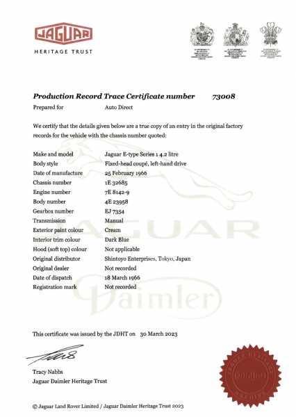 ジャガー Eタイプ Sr1 クーペ/正規D車(新東洋)/ フルレストア済/ オリジナルカラー(クリーム)/出生証明書
