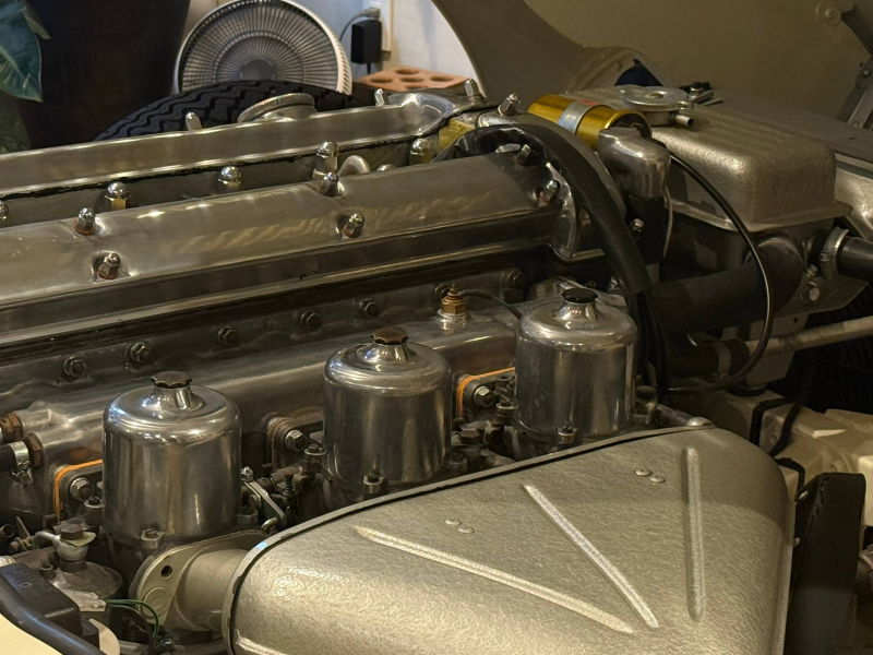 当個体はフルレストア済みの4.2リッターXK直6エンジン**SU 3連キャブレター(HD8)**を装備し、低回転から厚いトルクを滑らかに引き出します。オールシンクロの4速MTと相まって反応は軽やか。四輪独立懸架とディスクブレーキ、ワイヤーホイールがしなやかな乗り味を支えます。後年のストロンバーグ仕様とは異なる、Series1本来の吸気フィールをお楽しみいただけます。