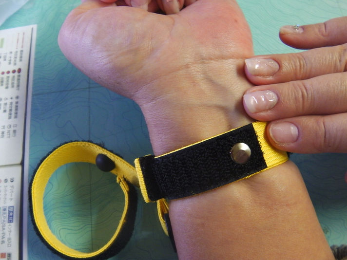 酔い止めバンドを左右の手首に装着し、内関にベルト裏側の突起が当たるように位置を調整して下さい。