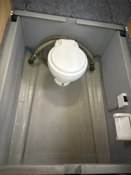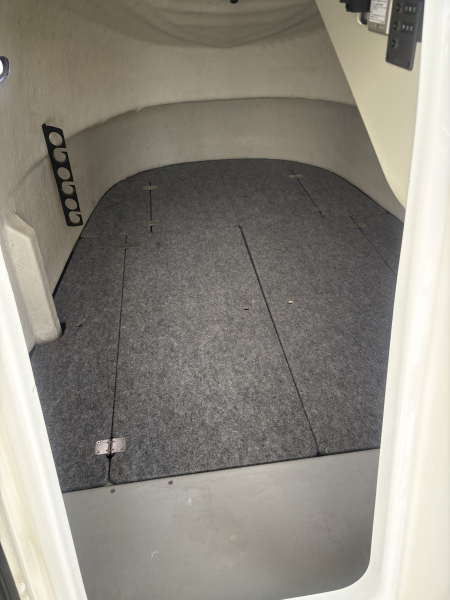 キャビン内にはカディフロアパネルが設置されており大人が横になれるのに十分な広さがあり多くの荷物を収納することが可能です。観音開きのパネル下には電動マリントイレを装備してあり女性や子供さんが同乗しても安心です。