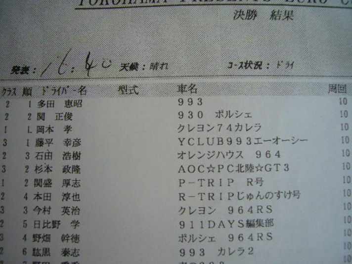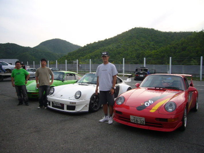 3コーナー4コーナー右タイヤダートに落としながら回避 冷汗(あとでR車オーナー スタート勢いあまりお尻が振ったとの事 納得)そして裏直線で4番手の993のインを取り なんと順位は4番 そしてヘアピンコーナーで前にいた996GT3が痛恨の回転 なんとそのおかげで3位 うそ〜 でも後ろから993の追い上げが凄い コースをある程度解っている私が  各コーナーインに付き直線でアウトに並ばれるは コーナーで交わしの連続で きづいてみれば10周走り終え なんと総合3位 クラス1位考えられない成績でした