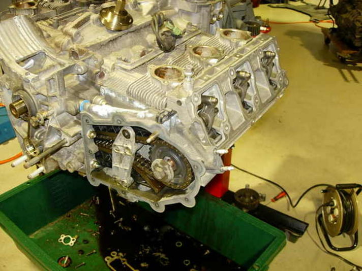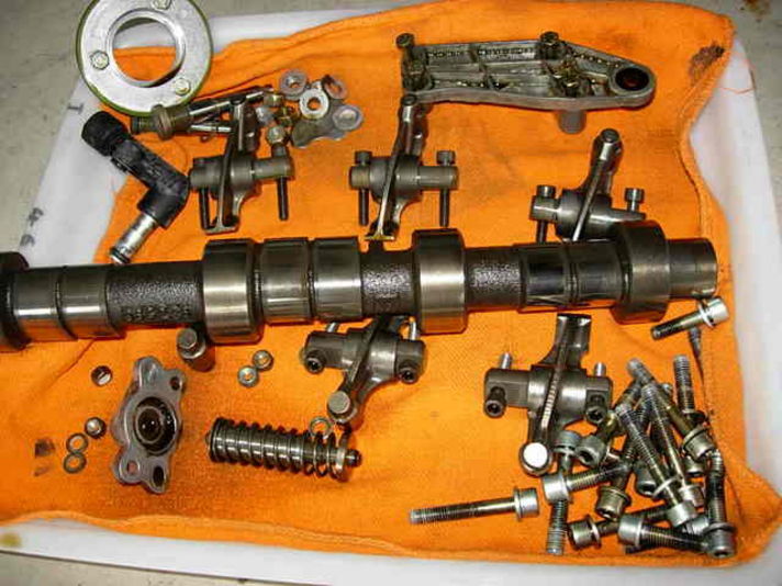 綺麗に洗浄され、歪などダメージの確認をしてカムハウジングの組付けです。中央の写真の部品は、すべてカムハウジングに取り付けられます。チェーンケースの中には、新しくされた、チェーンレールも納まっています。