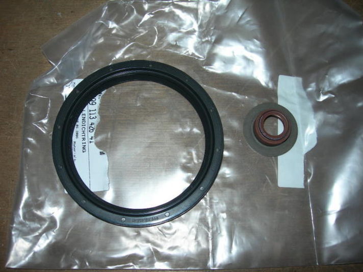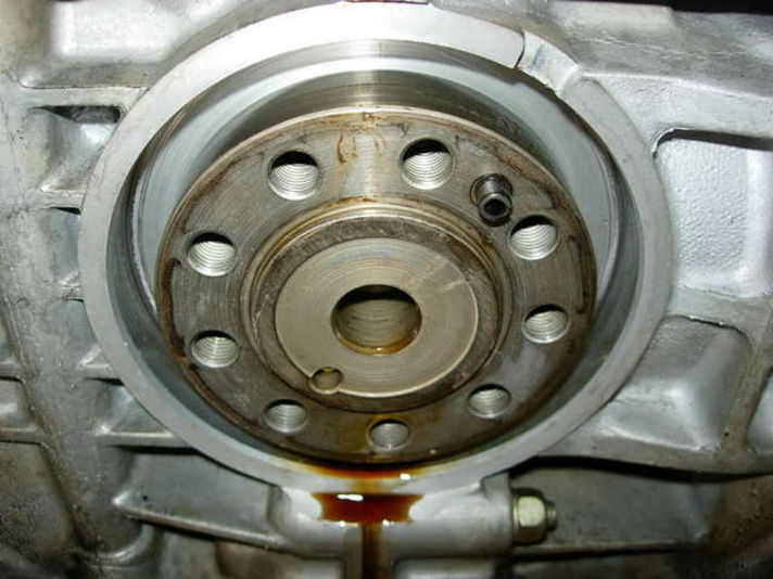 | オイルシールが外された写真です。エンジンのクランクシャフトシール交換です、この部分にフライホイール・クラッチの各パーツが取り付けられT/Mに動力が伝えられます。今回この部分からは、オイルは漏れていませんでしたが予防の為交換します。中央写真の細いシャフトはT/Mのシフトチェンジをする為のロッドになり、シフトレバーとつながります、シフトチェンジをする度に軸方向に前後しています、この部分からも、よくミッションオイルが滲み出てきます。このシールも、予防の為交換です。 |