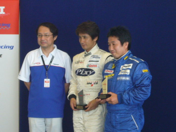 写真はエキスパートクラス優勝及び総合優勝の浜崎選手と日本の二輪のトップドライバーの伊藤真一選手と(ブルーレーシングスーツがヴェンチュラーの浜崎選手)