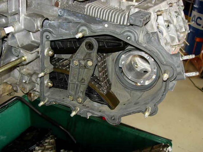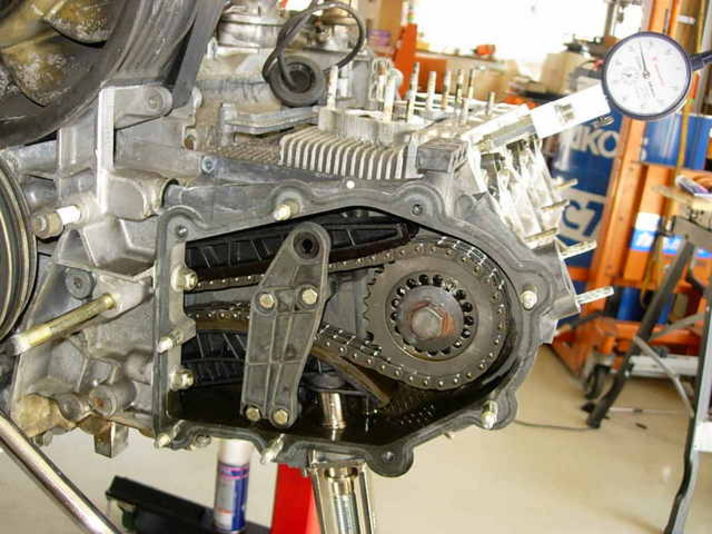 カムケース取付カムシャフトを入れ各部品を組み付けバルブタイミングを調整します、吸入排気のサイクルのタイミングはデリケートな物で、100分の1の、ダイヤルゲージでチェックしながらの作業です