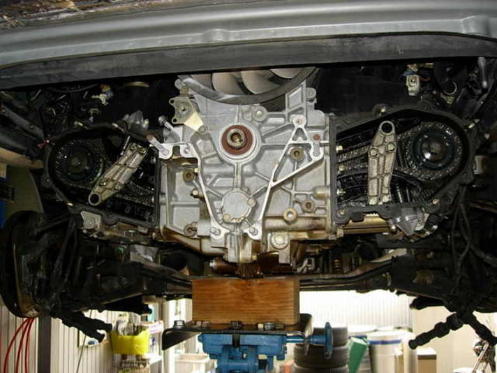 エンジン後方部分の作業です。タイミングチェーンが見えています。交換するパッキン、シール、Oリング類です。この作業をするのにエキゾースト、バンパーを外し必要があり、大変手間のかかるメンテナンスです。