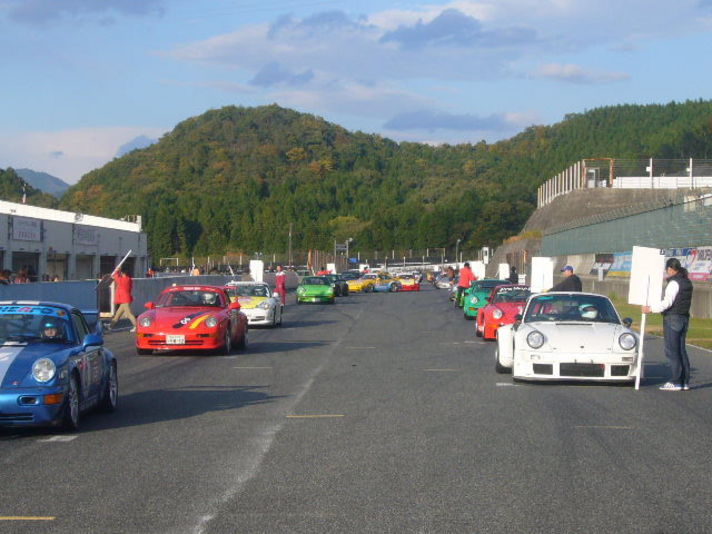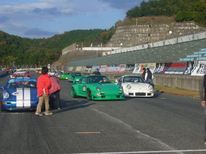 いよいよ決勝. 予定より20分送れ 路面はドライ 天気は晴れ 空気も乾燥 の一年でもっともエンジンパワーが出る季節でのスタート 私はピットロードに一番に並ぶ熱の入れよう そして一周のウームアップ この時点でキッチリとタイヤ ブレーキに熱を入れます ここがある意味スタートのポイントになります 決勝27台の戦士が各グリッドに整列していきます 私は総合10位なので イン側10番グリッドに並びました そしてエンジンを停止 スタート1分前の表示で全車エンジンに火が入ります この時.緊張感が体に 走ります しかし私すぐにいつものおまじないの言葉を三回心でつぶやき 緊張をほぐし スタート三秒前のレッドシグナルを待ちます そしてオールブラックでスタートしました 私なりに良いできのスタートで一台をパスして総合9位に上がり 一周めを無事クリアー.と思い二周目の裏ストレートで 私の抜いた157号車にすんなりと抜かれもとの10位になりました しかし今回は 後ろから911DAYS号がバックミラーに見えます さすが予選タイムは正直です そしてとりあえず前を追いかけて走ると五周目あたりに 先頭集団からの脱落車予選2位の車が要るではないですか とりあえずロックオンしかし直線スピードではさすがに追いつくわけが有りません 敵は964で少なくとも私より70馬力多いので簡単に抜けるわけが有りません パート4に続く 写真グリッドに並ぶスタート風景です