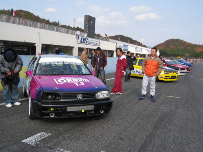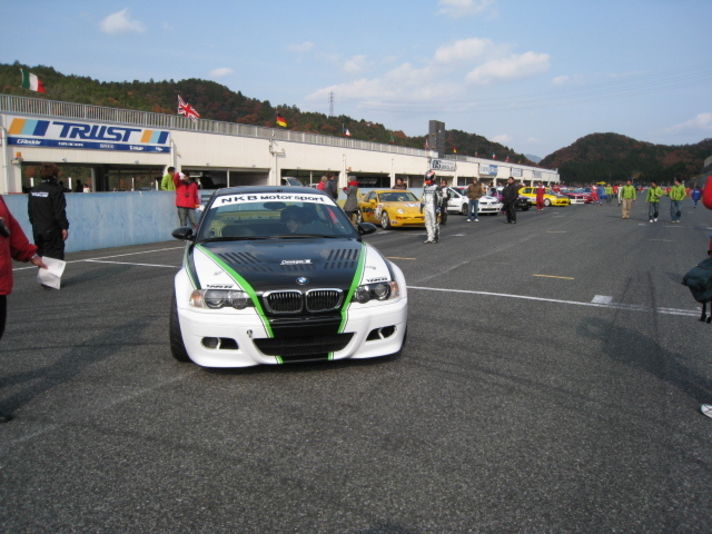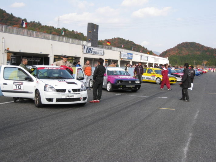 いよいよ予選のスタートです ドライバーは.当然練習走行で速さを見せつけた浜ちゃんのアタック 練習走行で35秒台後半のタイムが.どれだけ縮むかが見ものの予選 なんと練習より0.6秒縮め予選1分35.256の総合4位 クラス2位 浜ちゃんこと浜崎氏いや先生いや凄い 凄いの 乗るたびに早くなる底が無いのこの 人は!(ビールを飲ましたら そこの無いのは聴いていましたが(笑)) の 上位四台の 推定値段 1位 BMW M3 1000万円以上 2位ポルシェ968 1000万円前後 3位ルノークリオ 450万円前後 (あくまでも 私の独断と適当な改造費込み査定です 中古車屋のおやじの たわごとと 思ってお許しあれ) そんな 素晴らしい予選結果が写真のグリッドです いよいよ 決勝スタートです パート3に続く