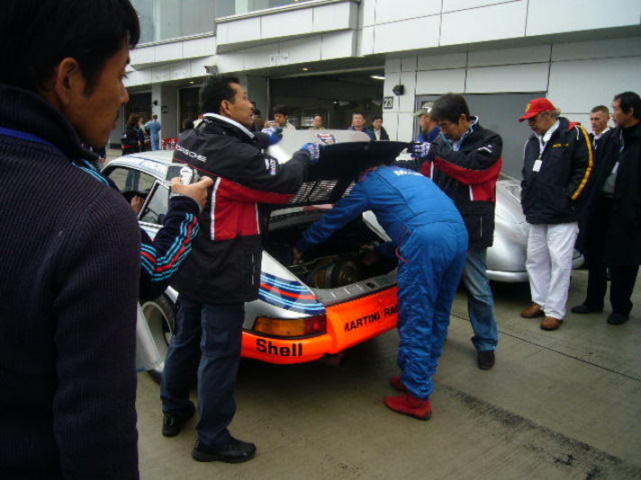 ルマンクラッシックが富士で開催され 本場ドイツのポルシェミュージアム 改装のため 四台のルマンカーが日本にやってきたことです お金をためてドイツのポルシェミュージアムに行き見ることは出来ても この四台同時に走る姿は見ることが出来ないので 富士まで早朝かにら仲間と高速を飛ばし日帰りで帰ってきたことです まん中の写真は ポルシェミュージアム館長がエンジンを掛けられるところです 物凄い爆音でしたが 素晴らしい音でした 後は ポルシェ好きにはたまらない記念撮影です |