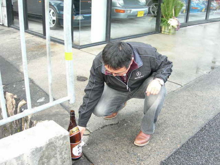 ガレージクレヨンに出向き店先に水をまき 酒をまき(正月なので松竹梅)