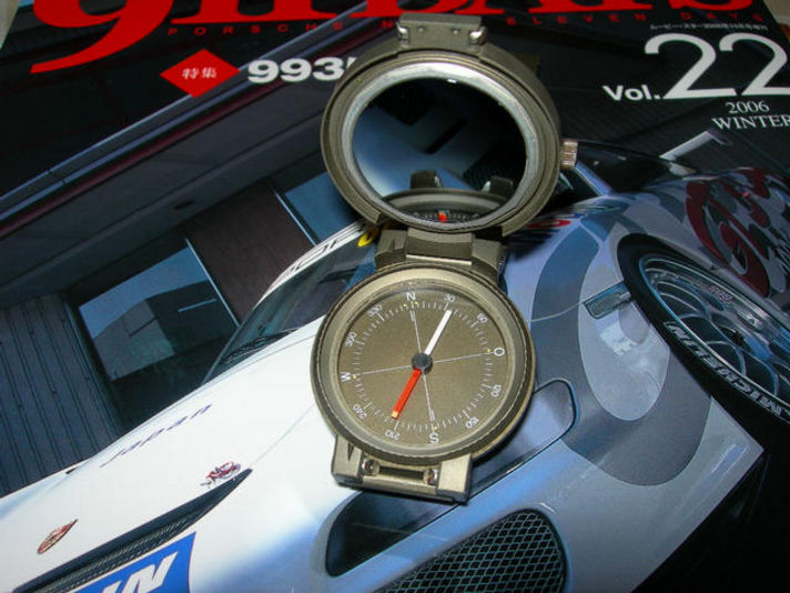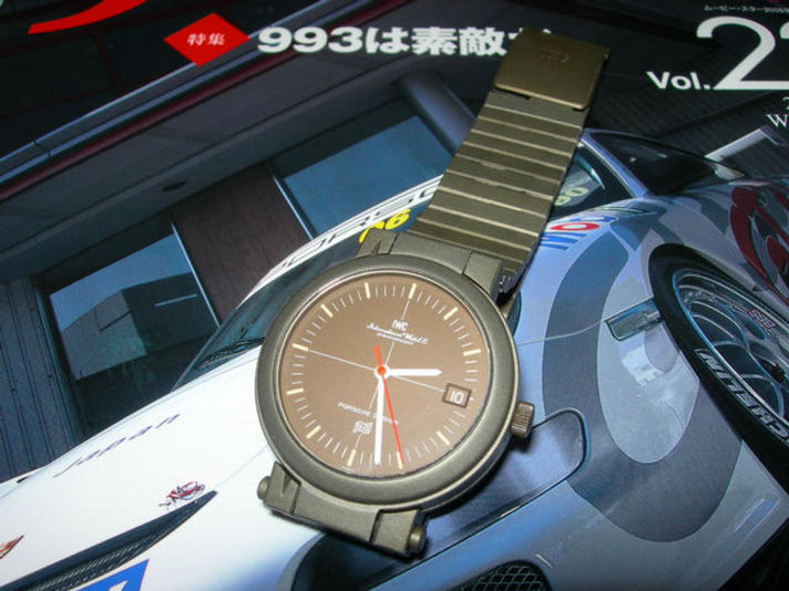 今回紹介する時計のIWC社はポルシェデザインIWC〜エテルナに製造が移行されています 個人的にはIWCの製造モデルを私は積極的にコレクションしています その中でも少し変ったモデルを今回は紹介します 1987年製造のアルミのコンパス付きタイプで写真で解かるように(930) フタを開けると文字盤下からコンパスが出てきてムーブメントの裏にミラーが 張られ ベルトが簡単に外れ 地図の上に平行に置ける仕掛けのある 少し変わった時計でその中でも材質がアルミ製とチタン製 表面が未塗装の物やマットブラック物など色々とありますが この時計はその中でも軍用に配られたとの.うわさのミリタリーモデルでIWCポルシェデザインの時計の中でも比較的人気の無い価格の安いモデルです(ガレージクレヨン岡本のうんちく) |