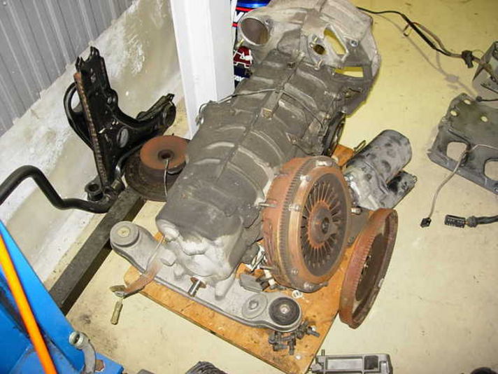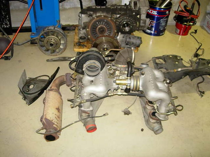エンジンにはさまざまな部品が取り付けてあります、順番に分解していくとそのパーツで、工場はいっぱいになります。これだけのパーツを取り外してようやくエンジン本体にたどり着き、その過程で問題点、交換の必要な部品も、チェックしていきます。