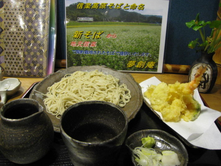 昨日の休みに 十割蕎麦を頂に行きました 今回紹介するお店は 以前新名神が開通して信楽インターができ 出口の信号を右に行き約一キロのところに位置する.とても解りやすく便利な所です 私の住む大津インターから約20分で到着する所です 店の名前は夢創庵です このお店の 蕎麦粉は地元信楽の契約農家物を使う100パーセント信楽の蕎麦です 蕎麦の太さは二種類有ります お勧めは細い方です 見た目は とても綺麗な蕎麦で腰は細さのわりには 腰があります (のどごし 抜群)持ってこられた店員さんが まずはそのままで少し食べて そして次は用意されている塩をふりかけて食べ 最後に漬け汁で頂くとの事.................試してみると 私は個人的に塩がとても美味しくいただけました 漬け汁は あっさりタイプで薄味で甘味を抑えた物です これだけは好みなのでなんともいえません 個人的には甘味の効いた漬け汁が好みますが この蕎麦には合っているのかなと思いました 塩で頂いた時は 私はとても美味しくいただきました そして デザートが有ります なんと蕎麦プリンこれは甘い物好きの私にとって頼まないわけありません 味はとろとろ牛乳プリンに蕎麦の香りと味をほのかに入れた美味しい物でです 上にふりかけているのは 蕎麦の実?皮?煎った物です 是非皆さんも一度言ってみてください メニューも丼物有りますので そばが苦って人もOKです 注意 お昼は12時30ぐらいで売り切れますので早い目に行かないと 店が閉まりますので 要注意 朝打った物だけ売る店です (美味しい蕎麦の基本 打ちたて 湯がきたてが基本形です 私の お勧めはシンプルにざる大盛です そし塩を軽く振りかけて頂いてください 美味しいと思いますよ........... 蕎麦の味か少し解るようになって来ました...........蕎麦は奥が深い........ |