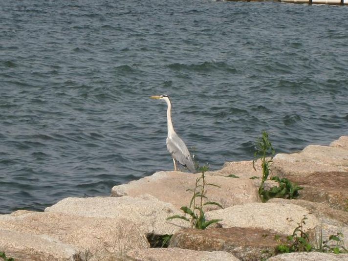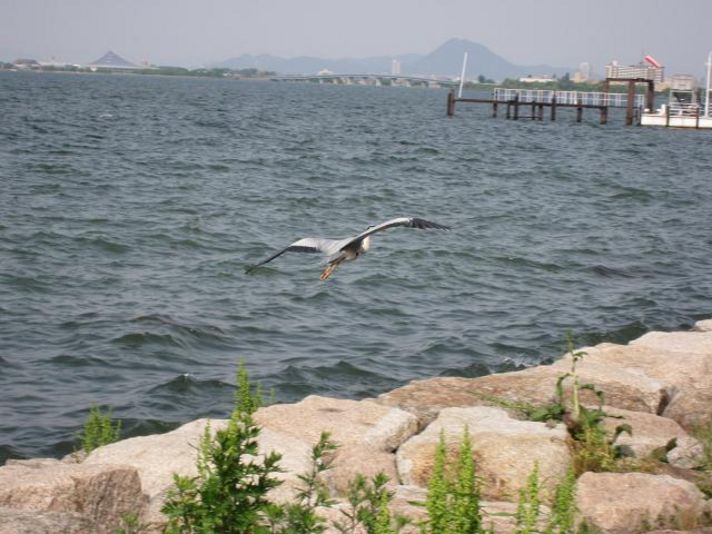 そして近江大橋をもどり同じ道を走ると.....なんと今度は目の前に大きな鳥がびわ湖を見ているでは有りませんか(この鳥はたぶんサギ?)立て約1メートルはあると思います