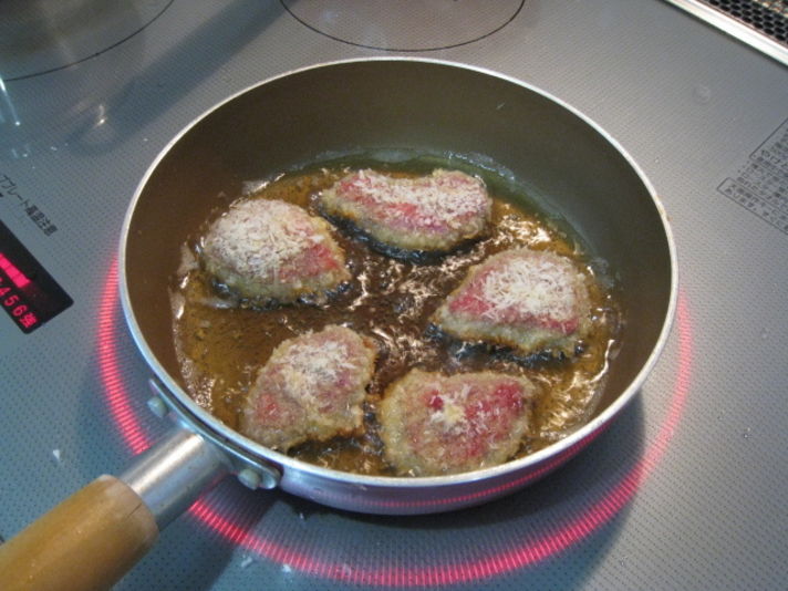次に フライパンに今回はイタリアンフーなのでオリーブオイルを肉が半分ぐらいひたる量にします そして 卵 パン粉の順につけ真ん中の写真のように上げていきます
