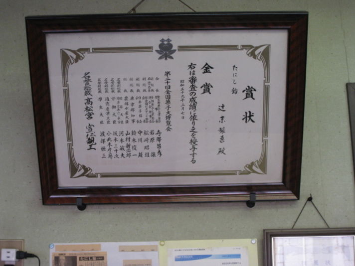 写真は瀬田の唐橋付近のお店の写真と 菓子コンクールでの金賞の賞状です