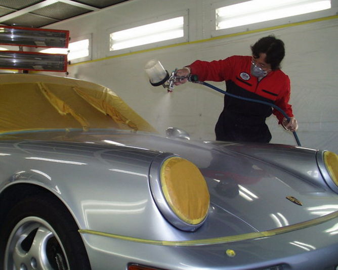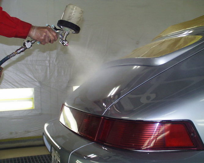 写真でお解かり頂けると思いますが コーティング専用のガンで吹き付けているので 実際に外で作業すると ホコリなどがボディーとコーティング剤にサンドイッチ状態になる事があるのでクレヨンではブース内で吹きつけしています