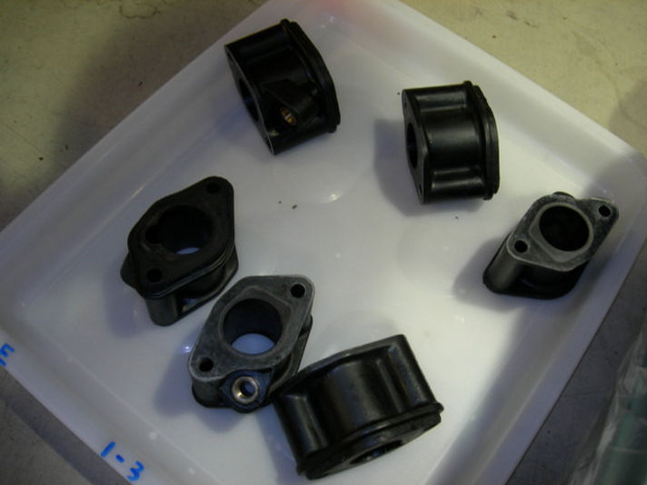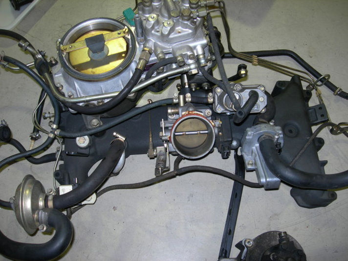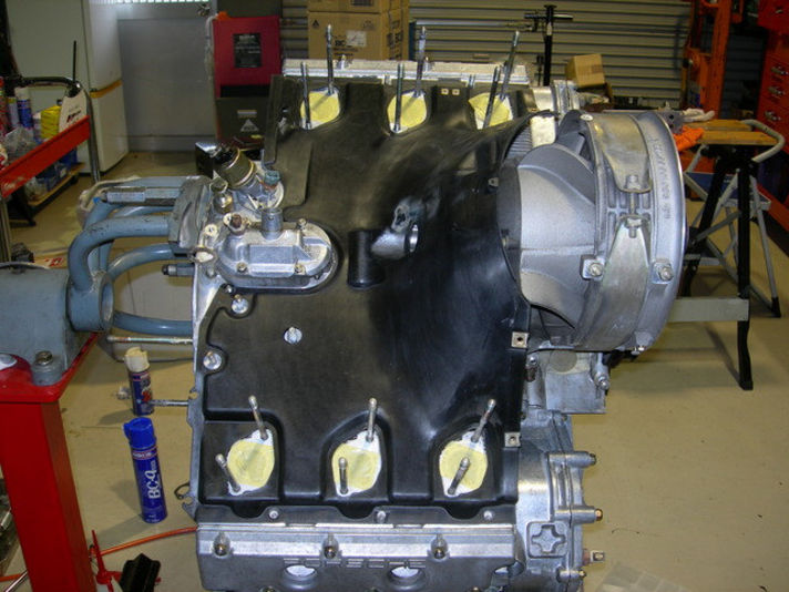 シリンダーヘッドに長いスタッドボルトが立ちました、ファンカバーを取付け、インテークを載せる準備が整いました、インマニフランジブロック、インテークフューエルデスビユニットをのせていきます。..