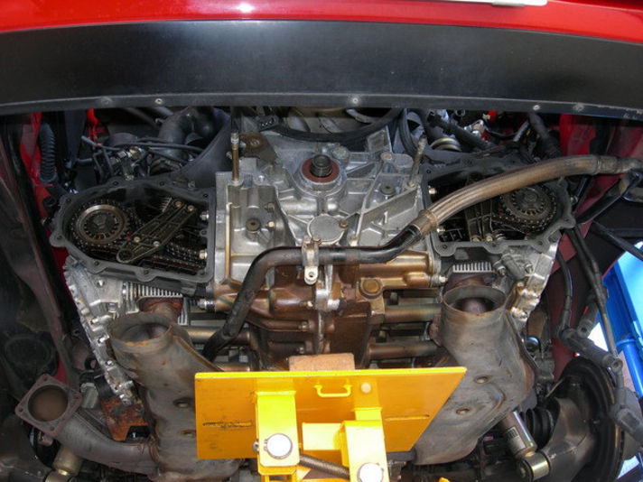 エンジンハンガーを外し、エンジンを下から支えながらの作業です。
