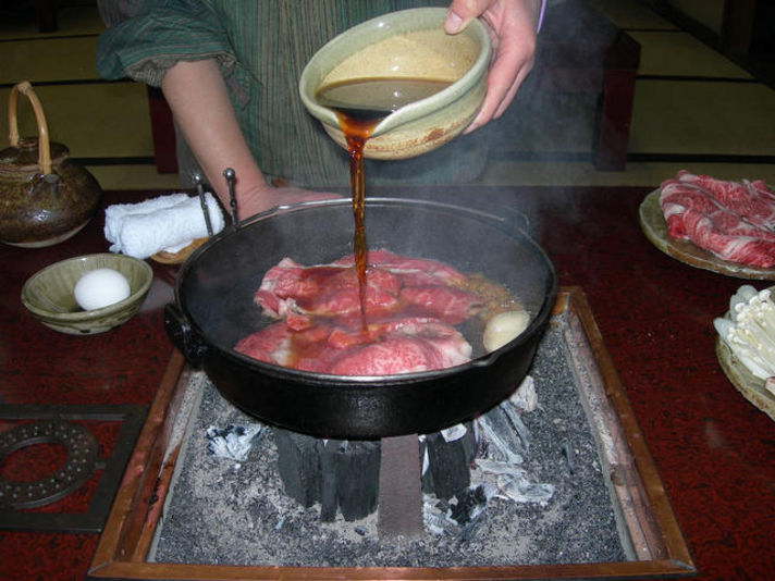 美味しいシリーズはすき焼き 今回は来月私の趣味の大型エンジン付き爆音自転車のツーリングの幹事を することに成り メンバーから近くで予算5000円台で美味しいすき焼きを 食べに行くことになり 場所 肉のブランド 値段を考三重県伊賀上野のこの店を下見に行くことになりました まず写真で分かるように火はガスでなく炭で肉はくら下ロース 味付けは専用の割り下(鰹 昆布みりん 薄口醤油 砂糖)です 火は炭火がすき焼きには一番ですそれは水分が一度に蒸発しないためです 味付けは割りしたは味でもめないため(沢山の好みの人がいくため) 肉はすき焼きに一番のくら下ロース ご飯赤だし付き税込5750円値段味二重丸 場所 近鉄上野市駅前 電話0595-23-4500