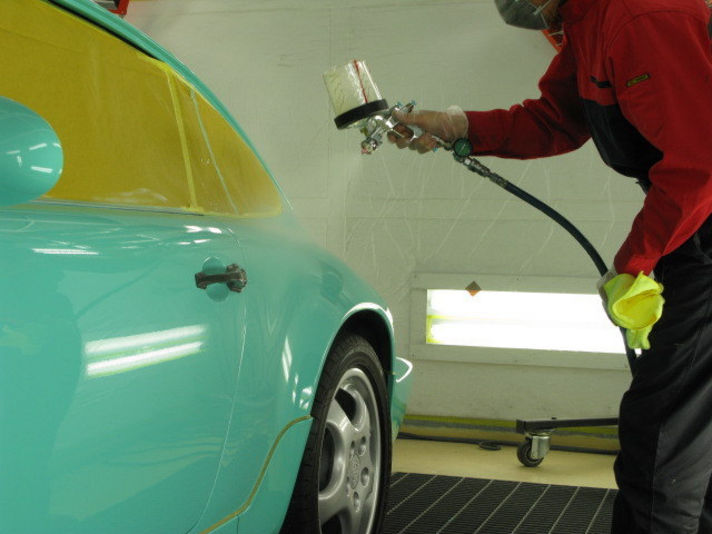 写真は塗装ブース内でのクォーツガラスコーティング剤を専用のガンで噴きつけているところです