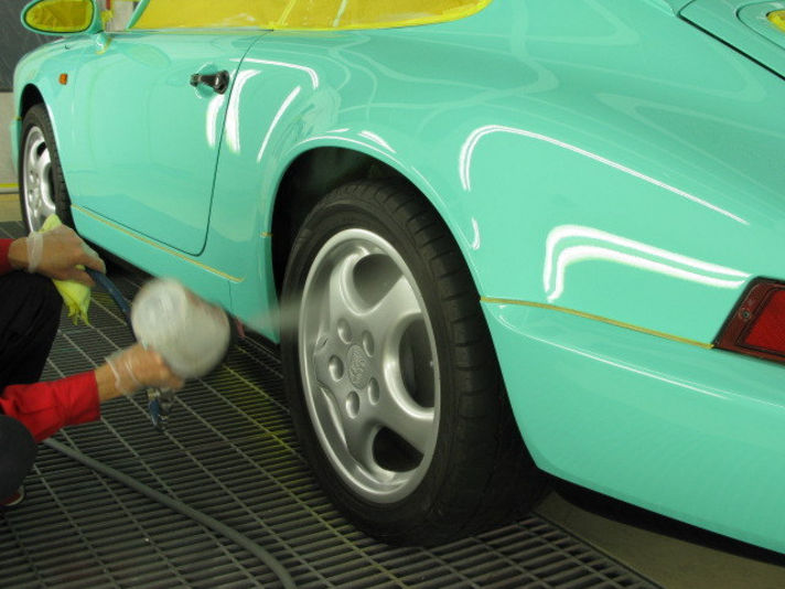これが一番目のコーティング作業です............. 右の写真でお解かりいただけると思いますがホイルにも施工いたします ホイルはヨーロッパ車全てよく汚れますが、この施工をしておくと 簡単に洗い流せます..........................