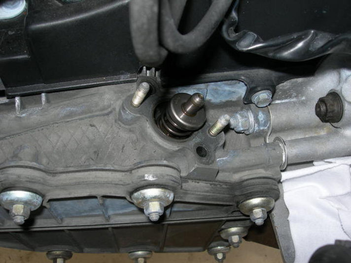 油圧ラインの一部のテンショナーブラッケット、オイル圧力でチェーンのたるみを、コントロールする構造です、きちっと取り付けしないとオイルが吹き出てきます、慎重に交換です。