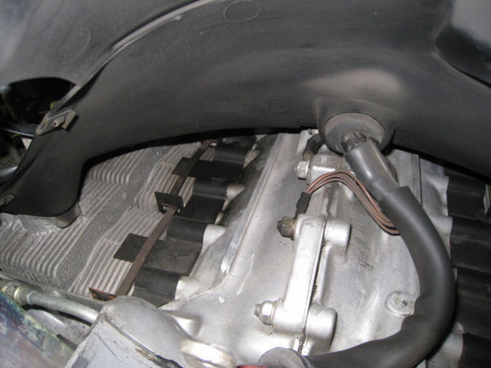 二番シリンダー上側のスルーボルトからオイルの滲みを確認しました。クランクケースに湿ったところ、下からでは確認できない場所です。