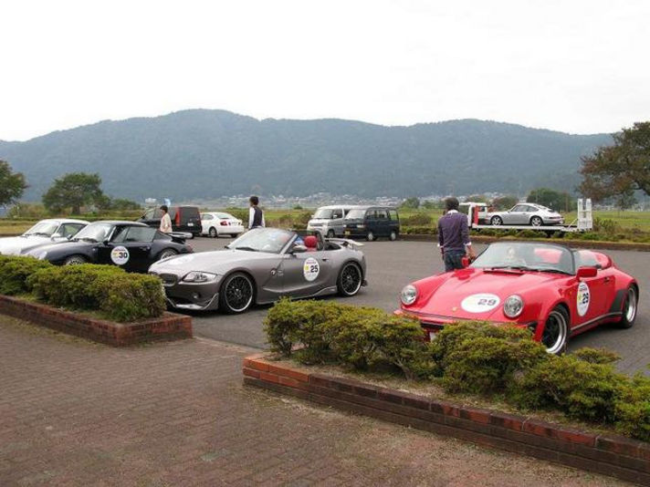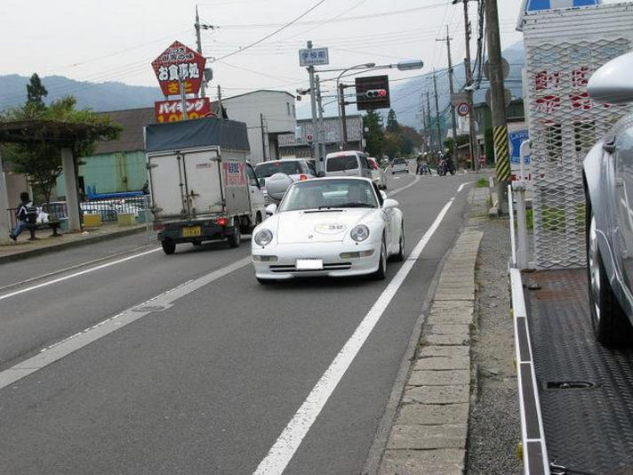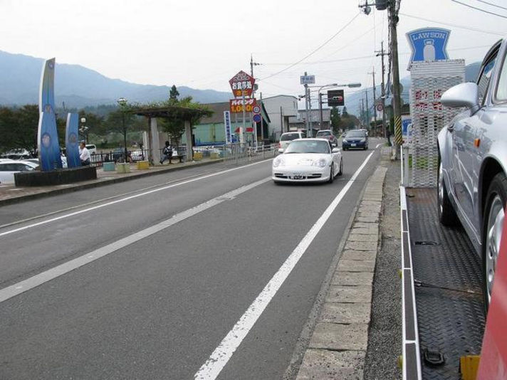 2CPはスタートから44.8キロ道 くつき新本陣です チェックを受けて次の目的地に向うところです..... (左右の写真はクレヨンのキャリアカーの横を駆け抜けて行きます) 真ん中の写真....3CP手前で少し時間調整? 写真の真ん中の奥に写っているのが クレヨンのキャリアカーに参加車両がトラブルをおきた時に レースを続けていただくためのTカー(私の愛車964TIp)です 今回は 一台もトラブルなく出動する事はありませんでした...良かった 良かった......(ガソリンも満タンにしておいたのですが(笑))