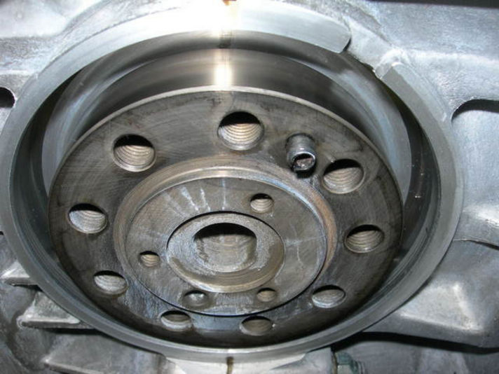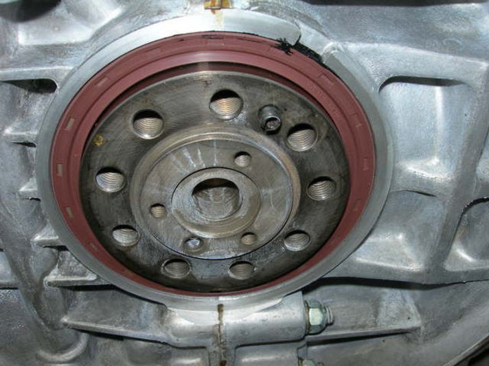 ミッションとエンジンを合体します クランクシャフトのフロント側・フライホイールが着くところのオイルシール交換です直径110ミリの大きなシールです、このオイルシールも意外とオイル漏れすることの多いパーツです。きちっと入れるためにはスペシャルツールが必要です、現行の997タイプのエンジンもいまだに漏れる車を見かけます・・・”クレヨンいとう”