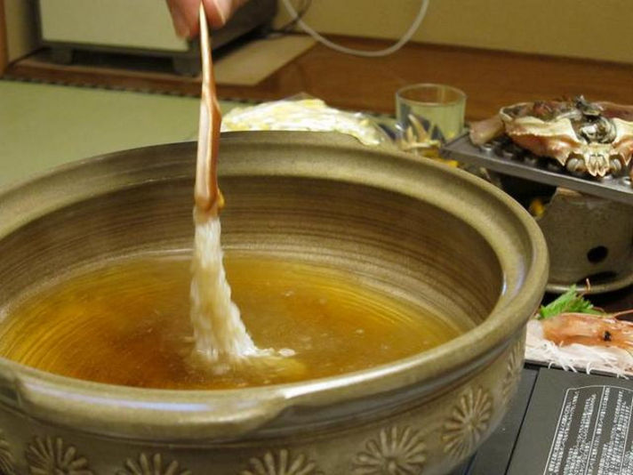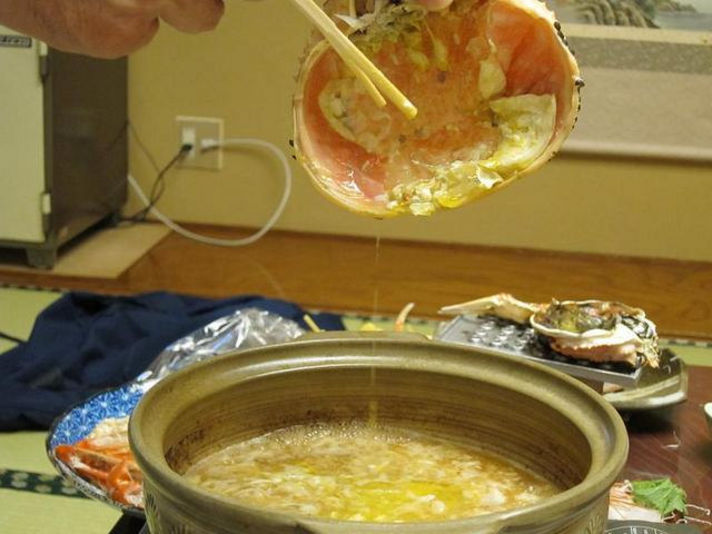 私は越前カニをどうやって食べるか、カニのお造りは美味しく思いません。 お造りは鍋でさっとしゃぶしゃぶ風に軽く火をいれてミソを付けて食べます。 この食べ方が、私の中ではナンバーワンです。 海幸苑自慢のゆでたてあつあつの茹でガニも美味しかったです。 そしてシメといえば・・・雑炊ですね