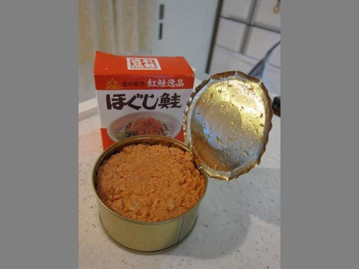 つづいて、写真のシャケ缶・・・ それも、フレークです。 美味しいから食べてみて と頂きました。 開けてビックリ、とにかくきれいです。 熱いご飯の上にのせ、いただきました。 一言・・・・・うまい!! どんな味かと言うと、シャケのいやらしい油の臭みがまったくありません。 上質な美味しい脂です。 やわらかい!安物のフレークは食べていると歯に挟まる感じがするのですが、これはまったくそれがありません。 思わずネットで商品紹介を見てみたところ・・・高い・・・! でも、説明文を読んでいると納得・・・ 材料は紅鮭だけを使い、丁寧に小骨を抜き取り、缶に詰めてからも熟成させてから出荷する・・・ 価格は これまたビックリ・・! 一缶1,365円です・・・これに、送料はもちろん別・・・! 言うまでもありませんが、私は買っていません・・・(笑)