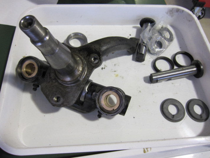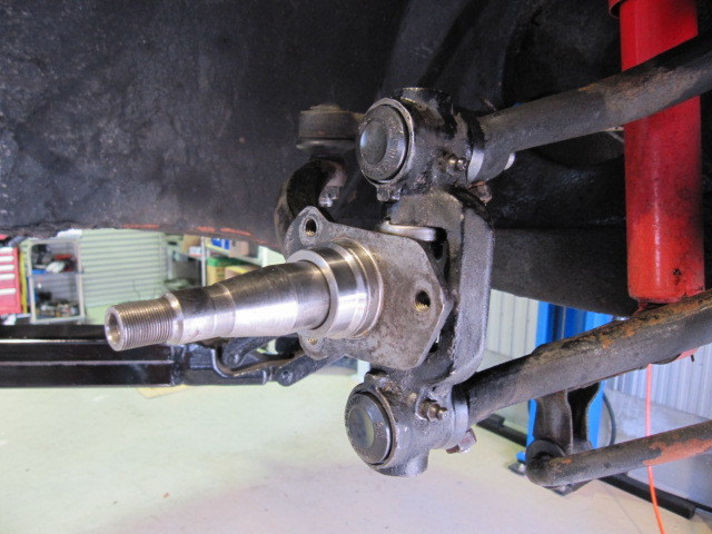 フロントハブ周りのブッシュやシャフトのガタがあり分解して新しい物へ交換しました。キングピンやサスペンションアームの軸・軸受けとなる部分です自動車ができ、量産車両の始まったころの構造は自動車の基本型です。
