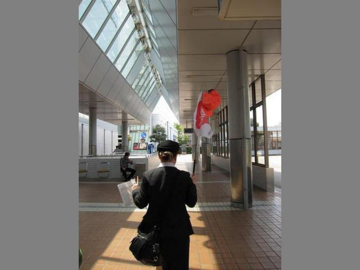 バスガイドさんのうしろについて、駅からバスまで乗る途中です