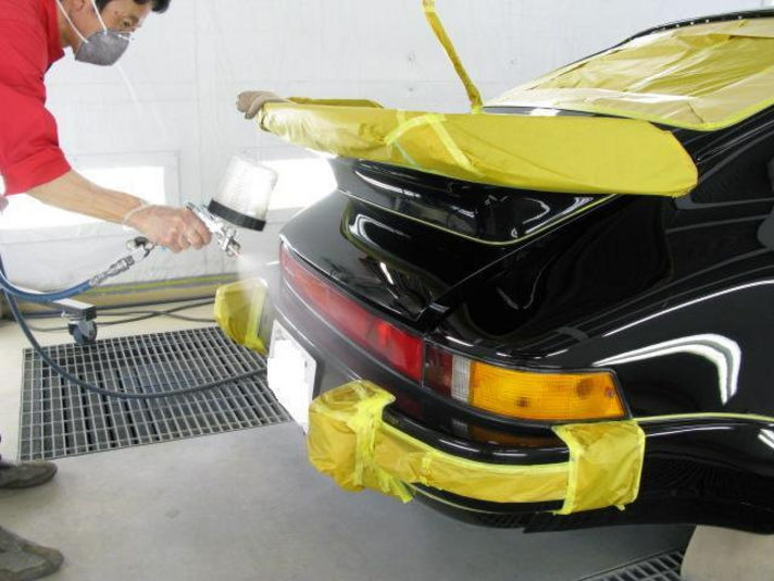 磨き作業完了致しました。 写真でお分かりでしょうか?しっとりと濡れた様な艶のあるボディに仕上がりました。 この状態を保つようにガラスコーティング剤を吹き付けてホディを保護していきます。 ボディ表面の1ミクロンにも満たない塗料の凹凸を埋め平坦化膜を形成し、9Hという表面硬度により埃などの食いつきを防ぐ作用を発揮します。 薄すぎず厚すぎず均等に吹き付けないとムラなど原因になりますので、慎重にかつ素早く吹き付けていきます。