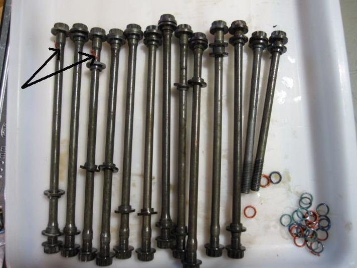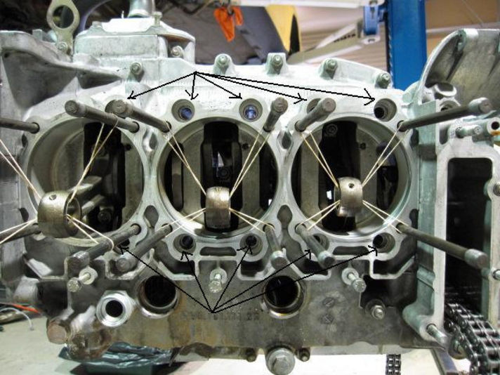 左の写真がスーボルトを抜き取ったクランクケースです 矢印の所が抜き取ったところです このボルトを抜きとのるにシリンダーまで分解しないと