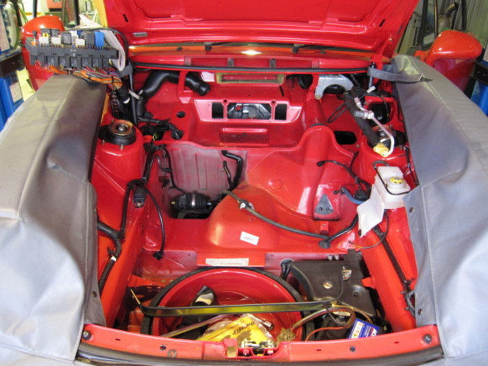 ガソリンを抜き取り、ガソリンタンクなどフロントフード内の物をほとんど全て取り外します