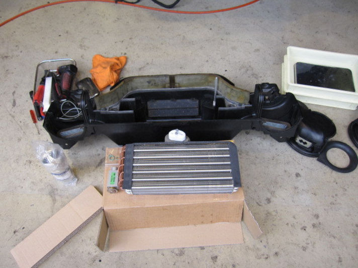右の写真エアコン関係の心臓部的なユニットを外し、次に写真の冷媒機のエバポレイターを交換します