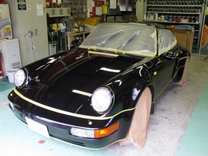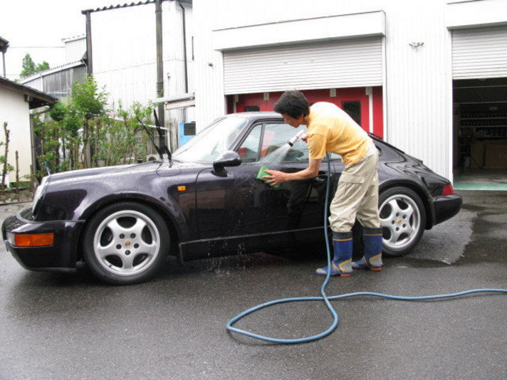 まずは洗車、専用の洗剤でボディのワックスの残りなど油分を洗い落としていきます。
