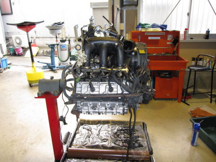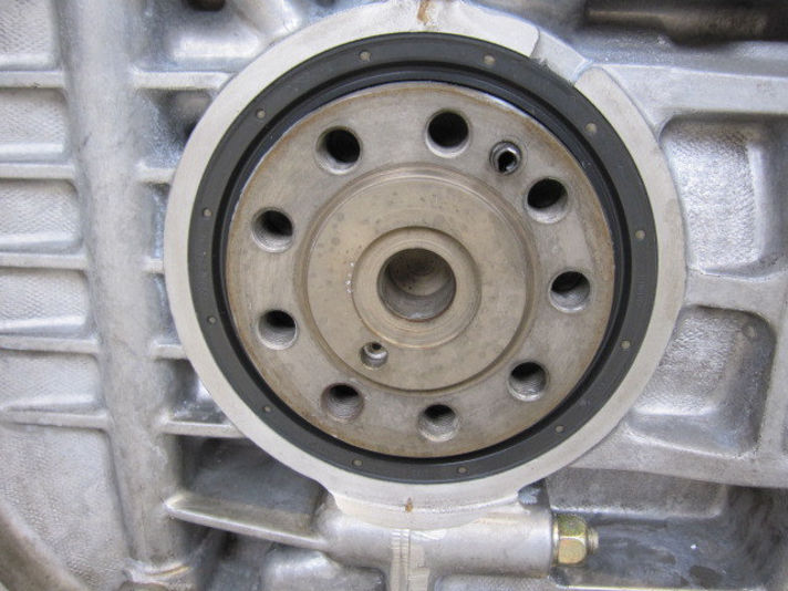 右の写真 エンジン台から降ろされ クランクシールの交換です
