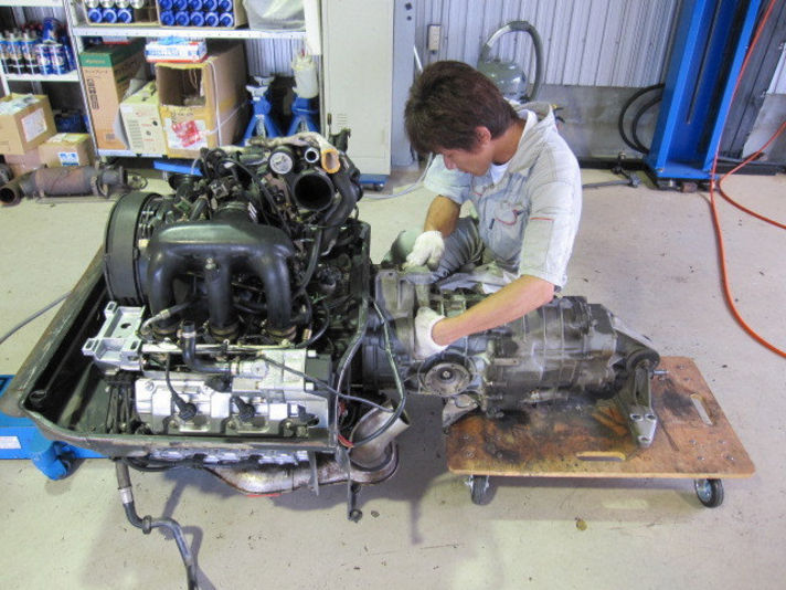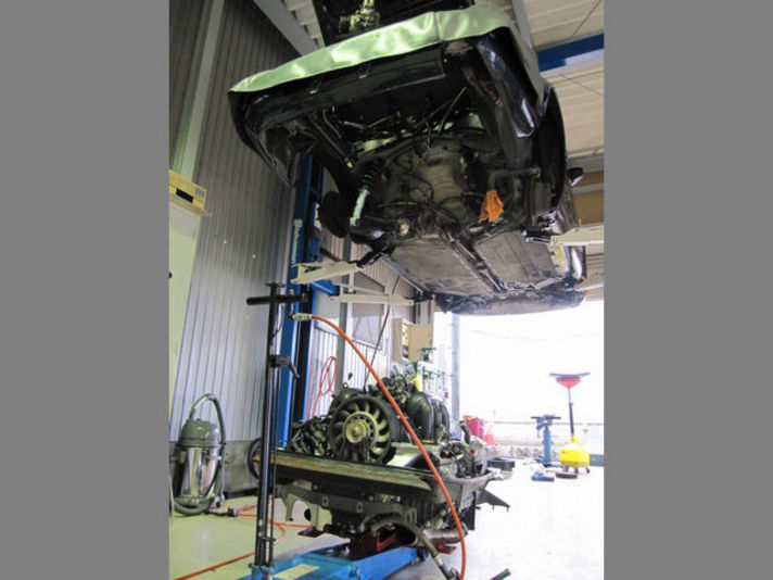エンジンを積み込むというよりも、写真のように、ポルシェの場合はエンジンを積むとうよりもエンジンにボディをかぶせると言ったほうが良いと思います(笑)