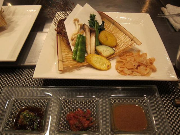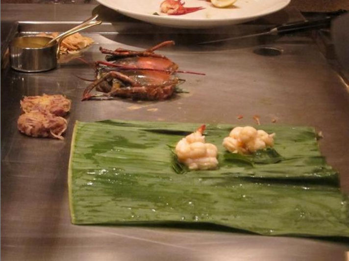 左の写真 オマールエビをバナナのはっぱで蒸し焼きにしていただきました。 真ん中の写真 季節の野菜も鉄板で綺麗に焼いていただきました。