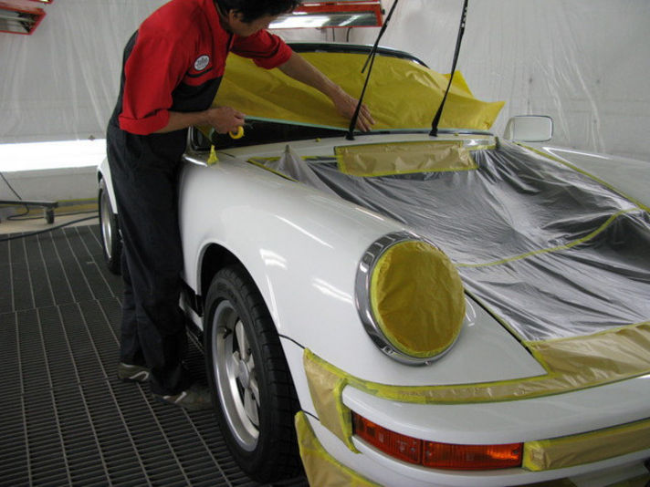 フロントフードはリフレッシュいたしておりますので後日の施工となりますが、その他の部分はコーティングを施していきます。