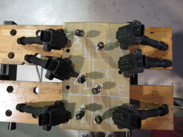 真ん中の写真ですが取り外したイグニッションコイルと取り外したスパークプラグを各気筒ごとに並べてみた物です。