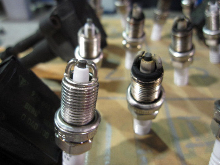 取り外したスパークプラグですが綺麗に全気筒焼けてますが、やはり新品と見比べて頂くと汚れ、減りがあります。エンジン燃焼室で点火という大事な役目をはたしている箇所ですので、定期的な点検、交換は必要です。