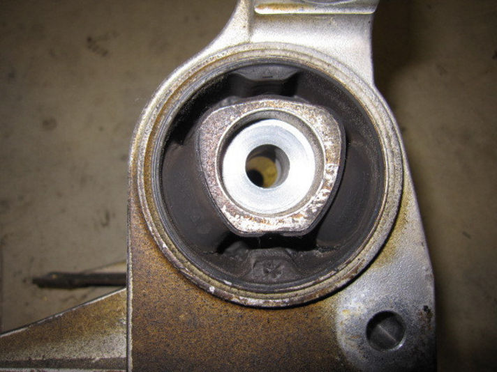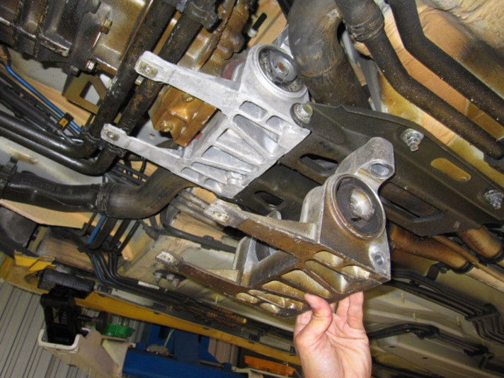 まず左の写真手に持っている方が交換したものです。ちょうど真ん中の部分がミッションマウントになります。ミッションマウントは両側にゴム製のブッシュが圧入されておりこの部分で振動を吸収しています。ブッシュ部分に不具合があるとシフトが入りにくい、振動が通常より大きくなったりします。