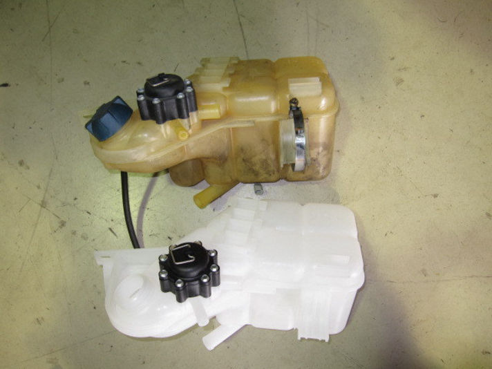 真ん中の写真クーラントリザーバータンクです。こちら新しい物と並べていますがクーラントによってタンク内に汚れが付着してきますので酷くなるとクーラントの量を確認出来ないようになってしまいます。今回そこまで酷くはありませんが、水廻りを整備してますので一緒に交換しました。