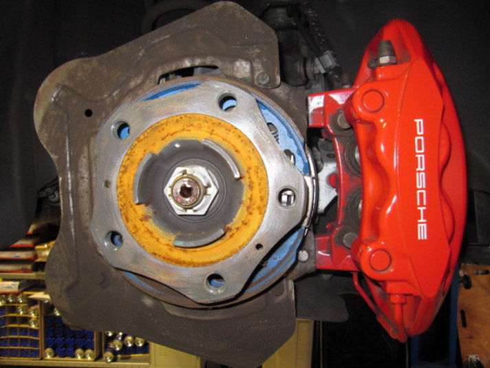 左の写真、フロントブレーキローターを外している状態です。